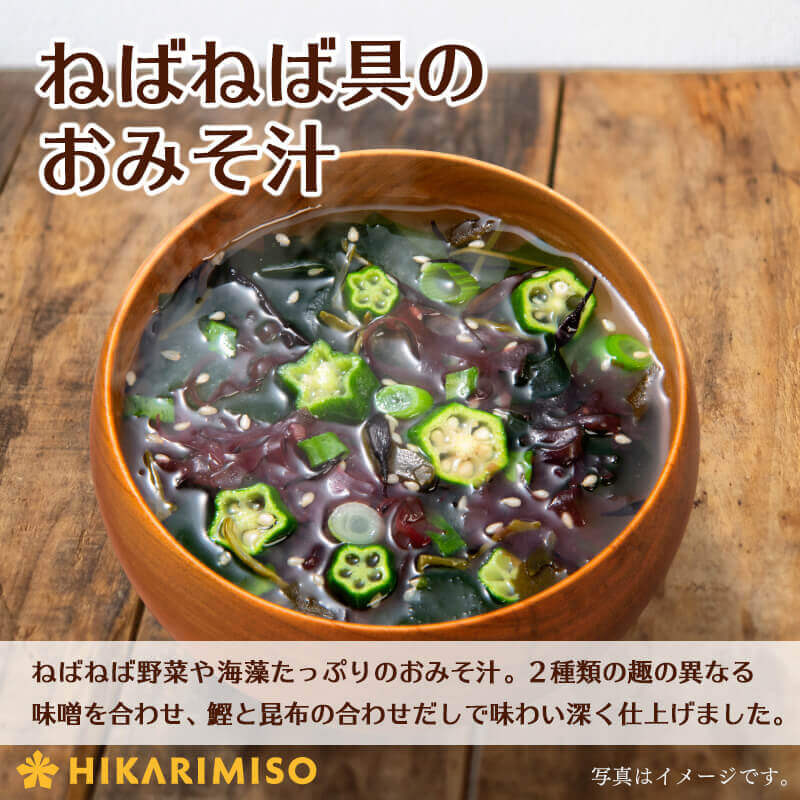 「オクラと5種の海藻」は、 オクラと 5 種類の海藻(わかめ、赤つのまた、ひじき、めかぶ、昆布)と ねぎとごまが入った具沢山のカップみそ汁です。