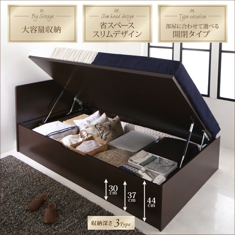 (送料無料) 組立サービス付き 収納付きベッド セミシングルベッド ベッドフレーム 横開き 深さラージ フラットヘッド大容量収納跳ね上げベッド Salomon サロモン 薄型スタンダードボンネルコイルマットレス付き コンセント付き 木製 省スペース ダークブラウン ホワイト