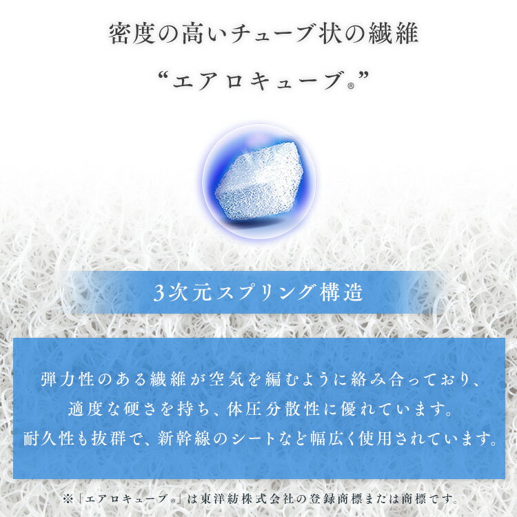 【密度の高いチューブ状の繊維エアロキューブ】3次元スプリング構造弾力性のある繊維が空気を編むように絡み合っており、適度な硬さを持ち、体圧分散性に優れています。