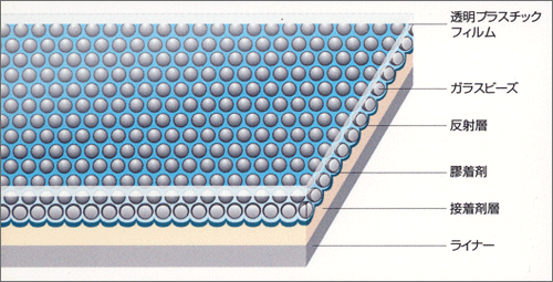 商品の特長 シートに内蔵した微小なガラス粒子により、入射光を光源方向に反射する再帰性反射シートです。
