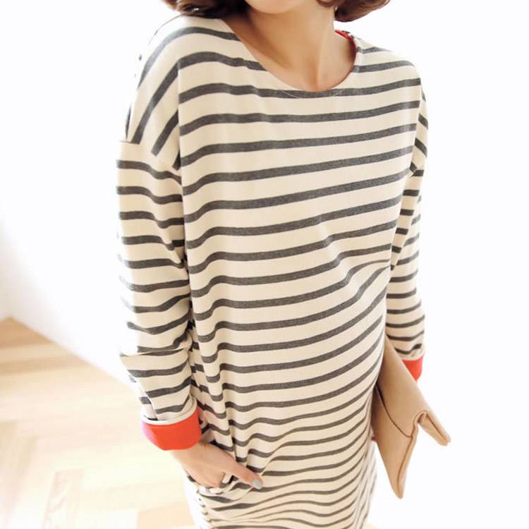シンプルで清楚感溢れるマタニティボーダー柄ワンピース。