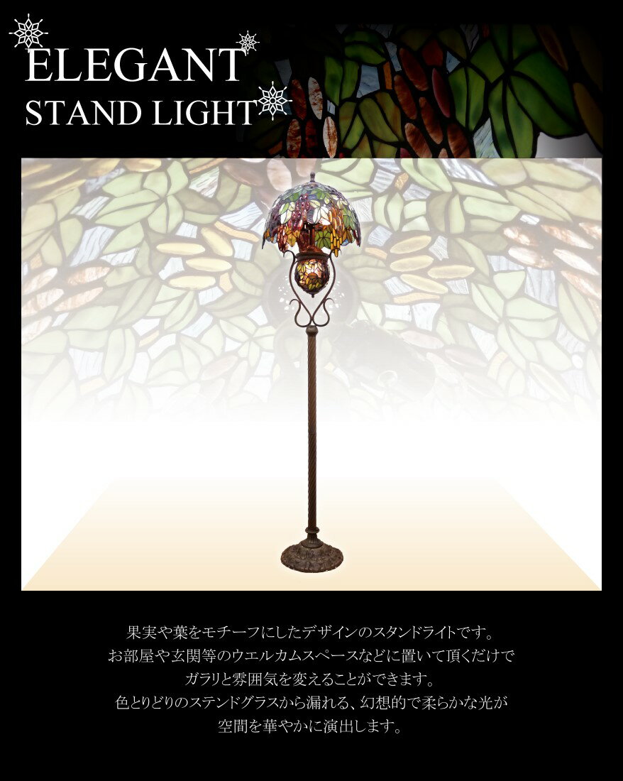 ステンドグラス フロアスタンドライトのご紹介 ●ステンドグラスで空間を彩る 果実や葉をモチーフとしたデザインが施された、色鮮やかなフロアランプです。