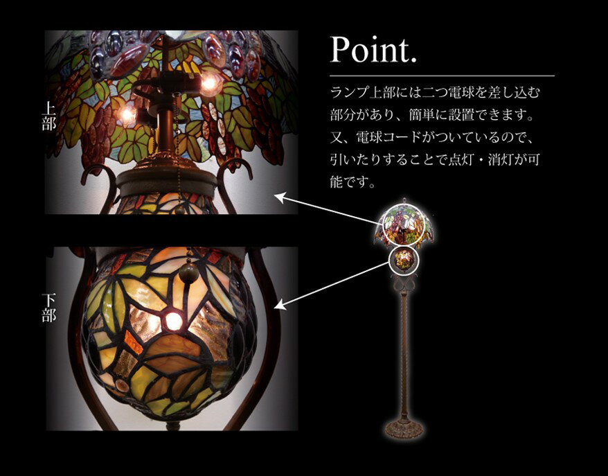 ステンドグラスランプ フロアスタンド [ぶどう] 透過する柔らかな明かりが空間に彩りをもたらす。