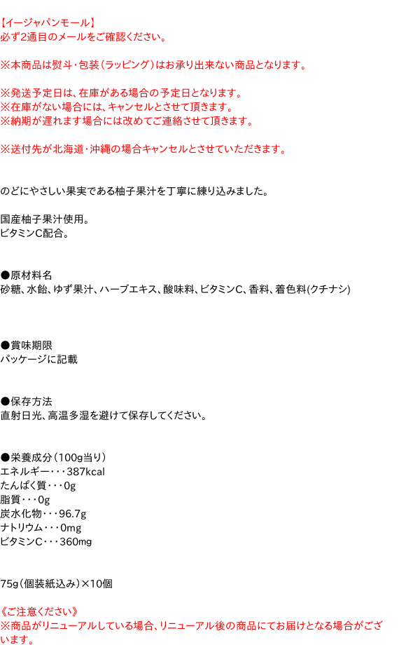 ●原材料名 砂糖、水飴、ゆず果汁、ハーブエキス、酸味料、ビタミンC、香料、着色料(クチナシ) ●賞味期限 パッケージに記載 ●保存方法 直射日光、高温多湿を避けて保存してください。